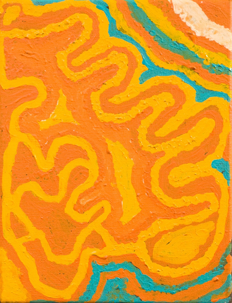 Ningie has painted some of her country located south of Balgo in the Great Sandy Desert. This country is known as Yula after the tjurrnu (soakwater) depicted as the circle in the painting. The many parallel lines represent floodplains as well as the tali (sand hills) found in this country. This is the country of Ningie’s youth.
